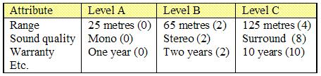 Any given product consists of a number of characteristics (size, colour, speed, etc.) at different levels (small, medium, large, red, yellow, green, slow, fast, etc.). These attributes at different levels are shown in a grid with the lowest levels of each attribute to the left increasing to higher levels towards the right hand side of the grid. The grid is then presented to the customer who is asked to allocate 100 points.